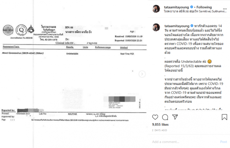 ผลตรวจคือ Undetectable ค่ะ Reported 15 3 63 คุณหมอรายงานผลให้ตอนบ่ายนี้ จากข่าวสารในช่วงนี้ ทาอยากให้ทุกคนไม่ประมาทและมีสติให้มาก เพราะ COVID มันน่ากลัวจริงๆค่ะ ดูแลตัวเองให้ห่างไกลจาก COVID ตามคำแนะนำของแพทย์กันอย่างเคร่งครัดนะคะ เริ่มจากตัวเองและคนในครอบครัวก่อน สุดท้ายนี้ ทาขอเป็นกำลังใจให้กับผู้ติดCOVID ทุกคน ขอให้หายโดยเร็วที่สุดนะค่ะ Tata หลังจากได้โพสต์ลงไอจี ก็มีคนเข้ามาแสดงความคิดเห็นกันเป็นจำนวนมาก